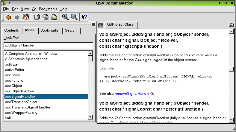 The Index tab is used to look up key words or phrases. See The 1 Minute Guide to Using TQt Assistant for how to use this tab.