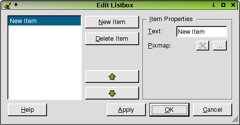 To add an item to the listbox, click the New Item. If you want to change the default name of the item, click the 'Text' line edit in the 'Item Properties' section and type a new name for the item. Click the Select a Pixmap to invoke the Choose an Image Dialog. Click a pixmap and then click the Delete Pixmap button to delete the selected pixmap. To delete an item from the listbox, click the item and then click the Delete button. To move an item up or down in the listbox, click the Move Up or Move Down buttons. Click Apply to accept the changes.